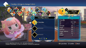 A Mirage has access to all spaces unlocked inside the Mirage Boards of its dissimilar forms, and whatsoever abilities and stat boosts unlocked is shared between all of them (excluding abilities unique to that particular form). Because of this, the Mirage that can tranfig to ane item form may potentially be stronger than another Mirage of that unlike course the player imprisms (such equally transfigging a Chocochick already in the histrion's party into a Chocobo, rather than imprisming a Chocobo separately).